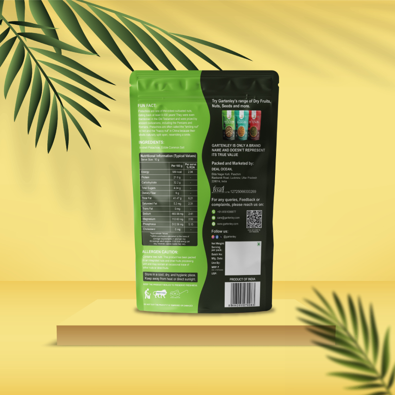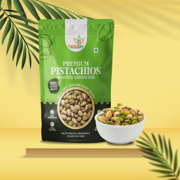 Enjoy Gartenley perfectly roasted, lightly salted pistachios for a satisfying crunch! Rich in Protein, Dietary Fiber, Magnesium, Phosphorus and healthy Fats.